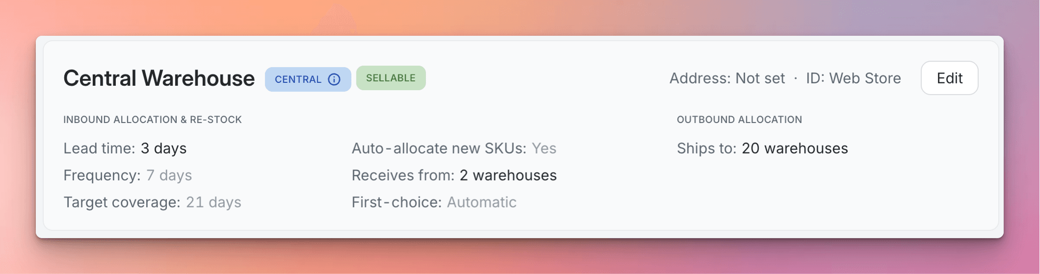 Auto-Allocate-new SKUs: Toggle ON to automatically create an initial allocation setting the moment a new SKU registers its first sale in this warehouse. Toggle OFF to enforce manual setup for all new items.