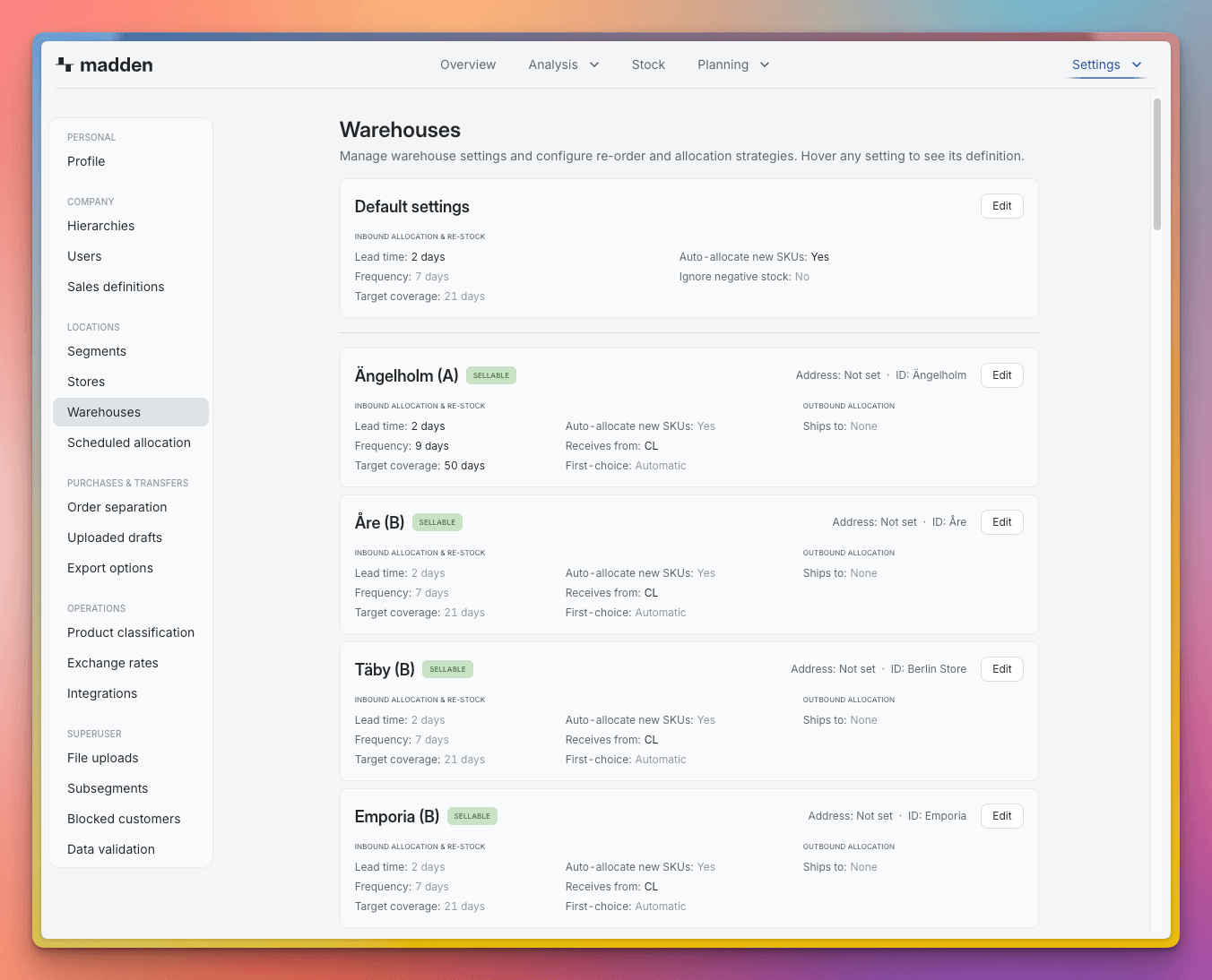 Warehouse Settings define how Madden views each physical inventory location and sets the allocation logic that governs how inbound stock is distributed. Configuring these settings is the first step toward efficient, automated inventory planning.