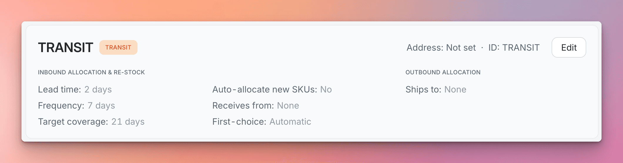 Example of a Transit Warehouse configuration. Inventory in this location is considered incoming (in-transit) and is not available for sale.