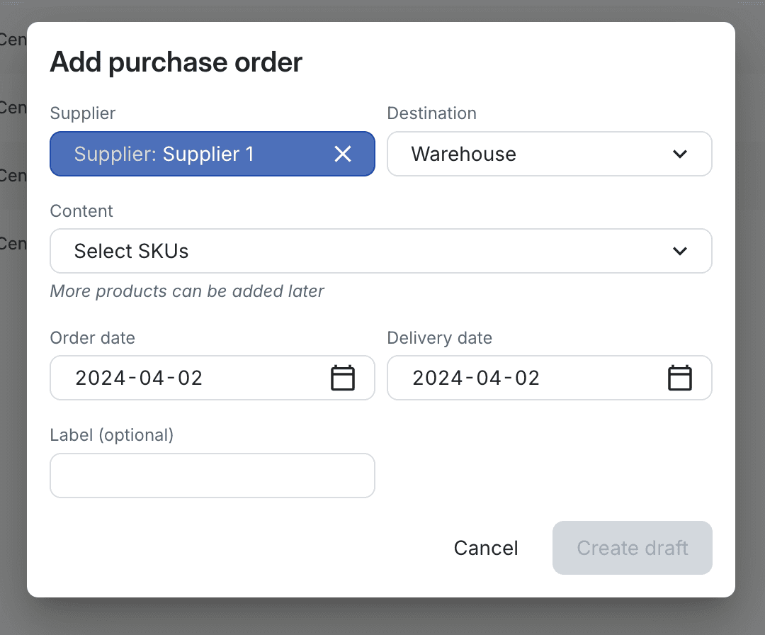 Fill Details and Create: Enter the Order date, Delivery date, and any optional Labels. Click Create Draft.