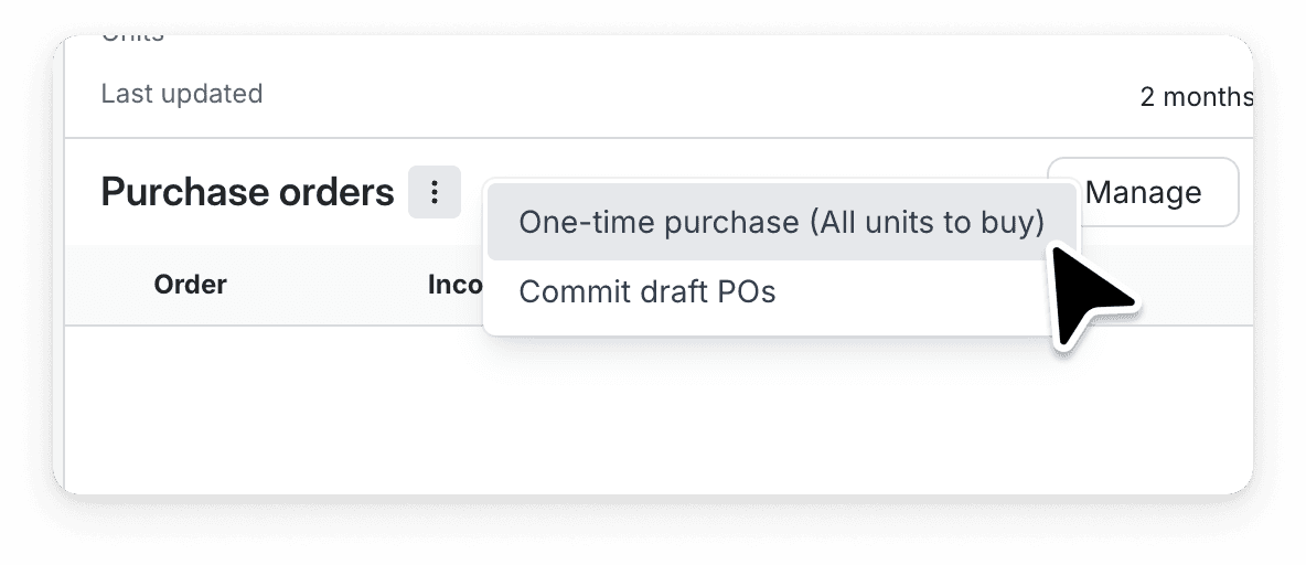 Planning for One-Time Buys: For products where you only plan for a single purchase, like seasonal items, navigate to the purchase orders section and choose the One-time purchase (All units to buy) option.