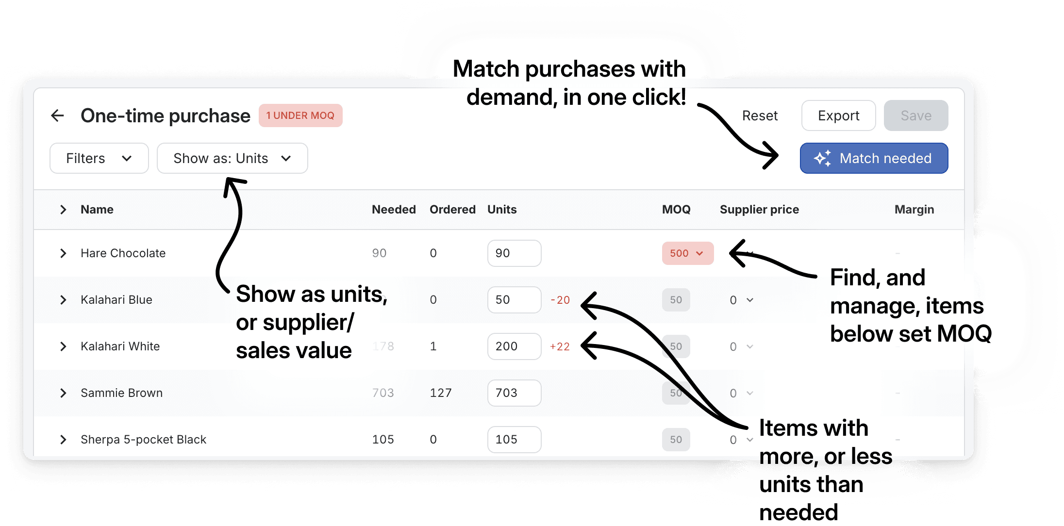 Easily match your ordered quantities with your calculated need (sales plan + any pre-orders - existing and incoming stock) by clicking Match needed.