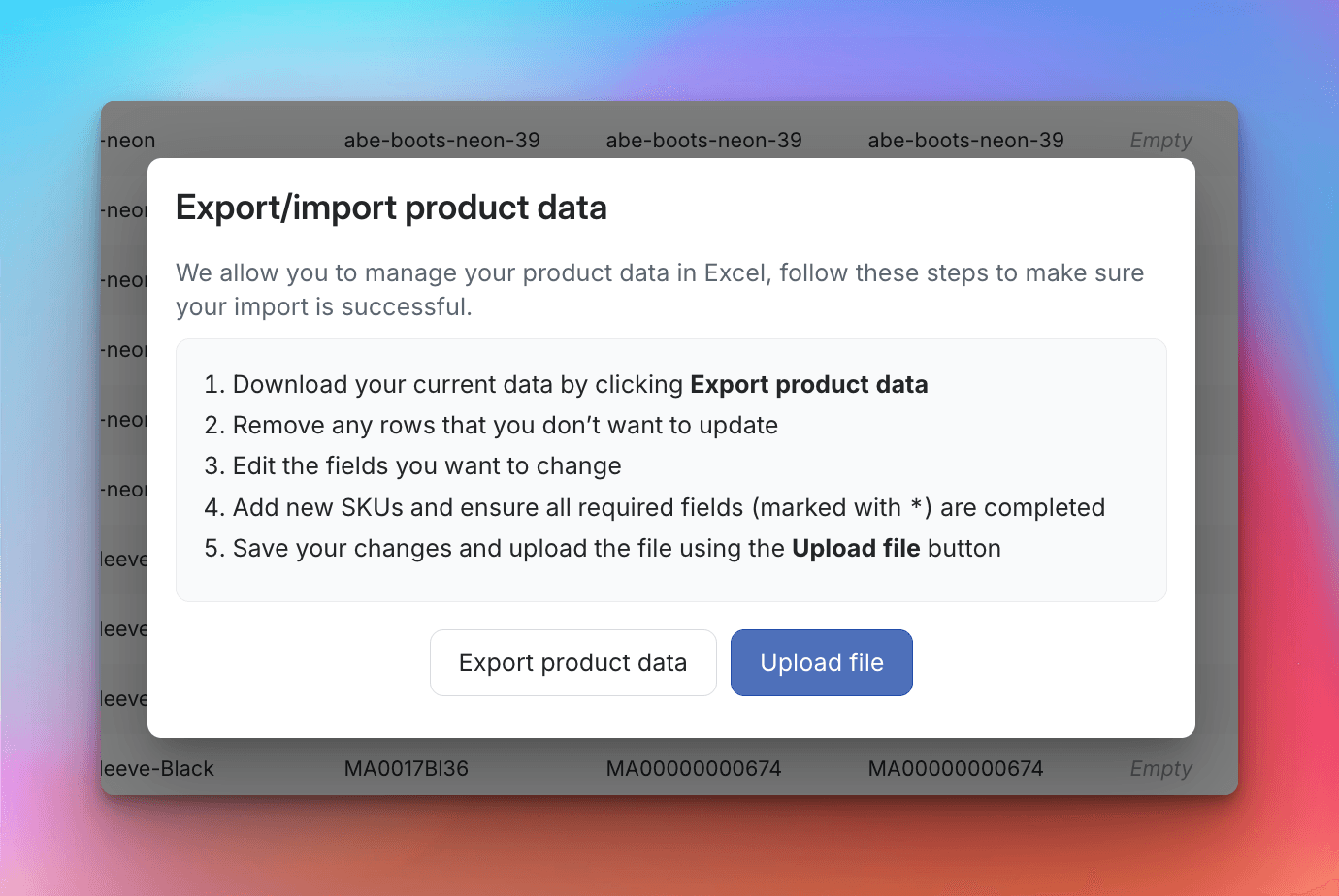 Export Product Table: First, use the export button in the product interface to download your current product table.