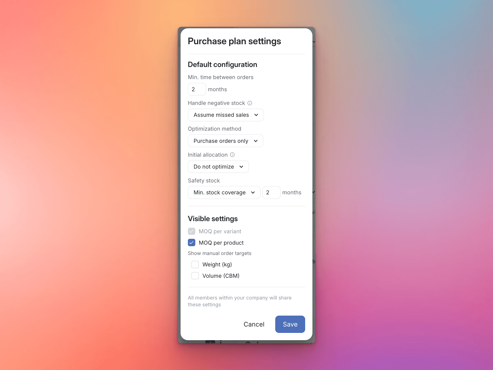 Review the Visible Settings section. Here you can select which key purchasing metrics (beyond the required MOQ per Variant and Lead time) you want to display for easy reference within the Purchase Plan view.