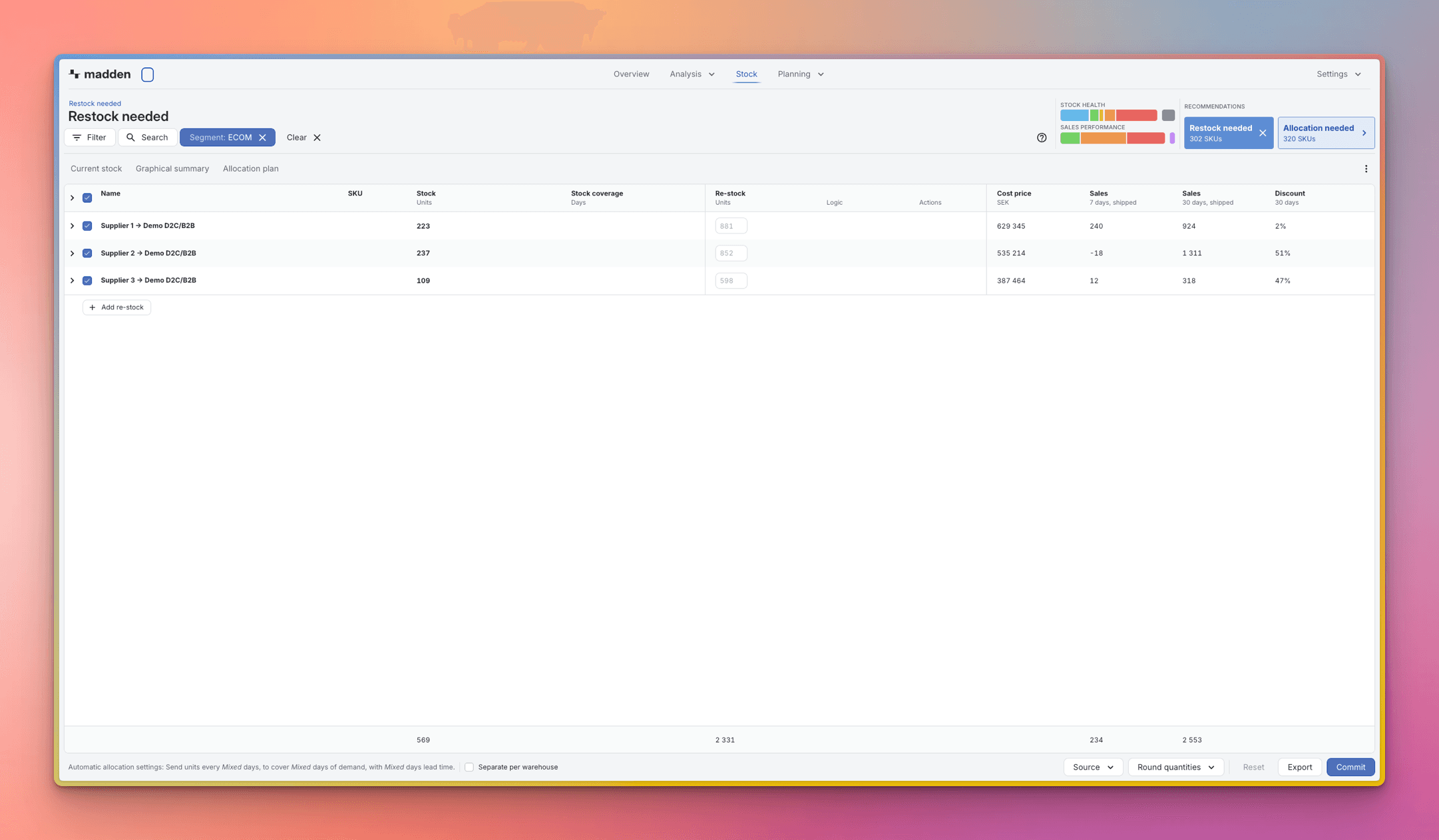 Automated purchasing recommendations based on target inventory coverage and lead times.