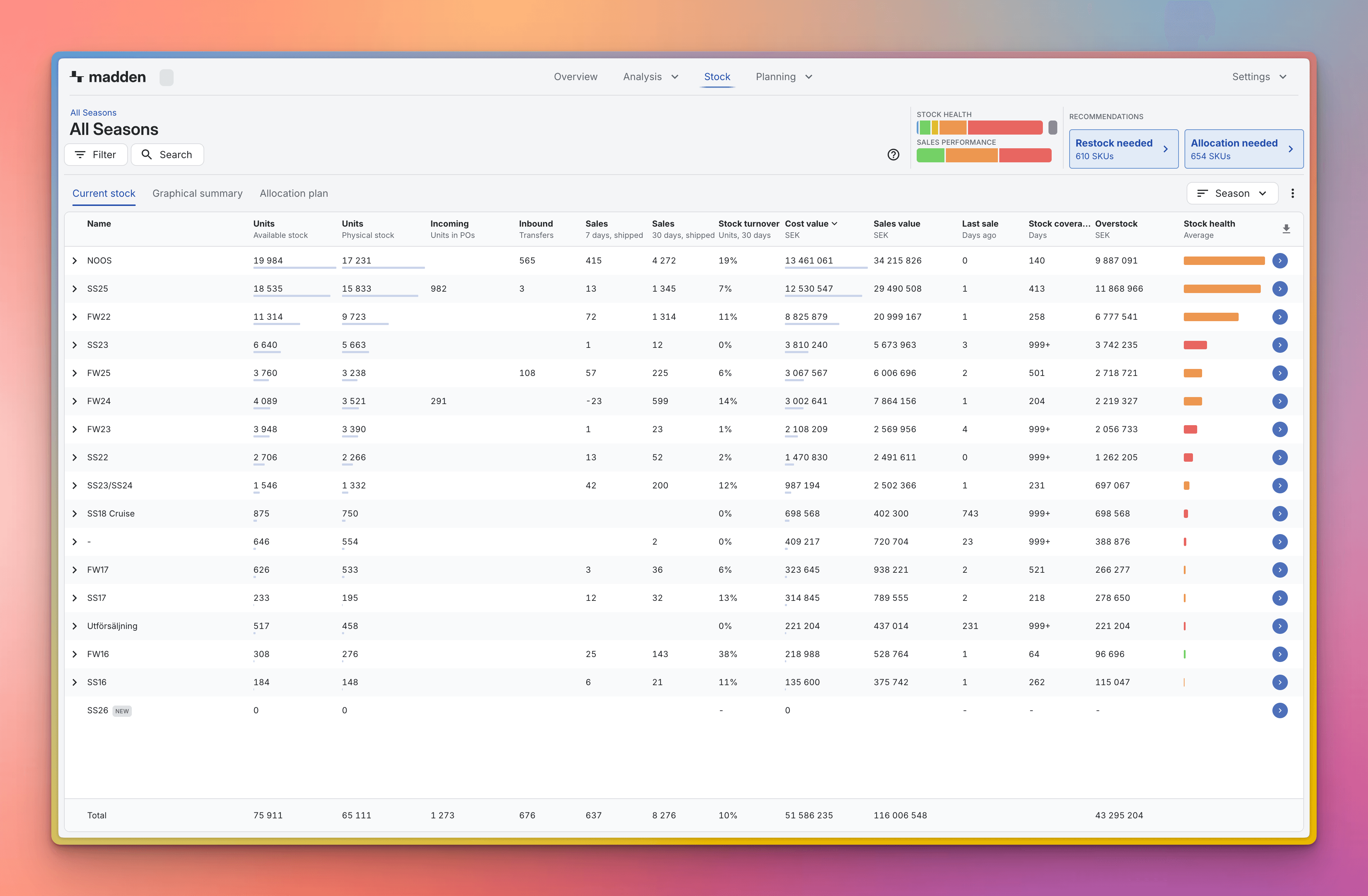 The Stock Module is Madden's core tool for managing and analyzing your inventory. It provides a real-time, comprehensive view of where your stock is, its current value, and how long it is expected to last based on projected demand.